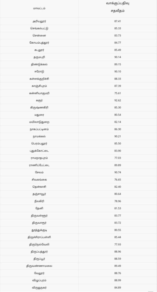 வரலாற்று சாதனையாக நடைபெற்று முடிந்துள்ள 2026 தமிழக சட்டமன்றத் தேர்தலில், இரவு 10 மணி நிலவரப்படி மாவட்ட வாரியாக பதிவான வாக்குகள் சதவீதத்தை இங்கு காண்போம்.மாநிலத்தில் மொத்தமுள்ள 38 மாவட்டங்களில் அதிகபட்சமாக கரூரில் 92.62 சதவீத வாக்குகளும், குறைந்தபட்சமாக கன்னியகுமரி மாவட்டத்தில் 75.61 சதவீத வாக்குகளும் பதிவாகி உள்ளன. தலைநகர் சென்னையில் முன்பு எப்போதும் இல்லாத அளவுக்கு 83.73 சதவீத வாக்குகள் பதிவாகி இருக்கின்றன என்பது குறிப்பிடத்தக்கது.