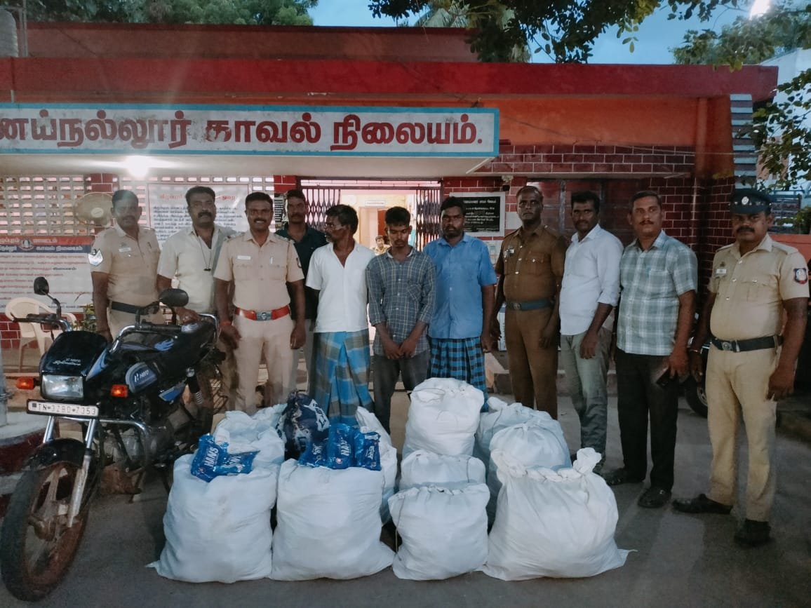 காவல்நிலையம் அழைத்து வந்து விசாரணை மேற்கொண்டதில் பொறக்கன்தாங்கள் பிள்ளையார் கோவில் தெரு, செல்வம் என்பவரின் மகன் கிரண் குமார் வயது 22 மற்றும் திருக்கோவிலூர் தாலுகா எம்.குன்னத்தூர் பகுதியை சேர்ந்த ஏழுமலை என்பவரின் மகன் செல்வம் வயது 47, கிருஷ்ணமூர்த்தி என்பவரின் மகன் யுவராஜ் வயது 36 ஆகிய மூவரையும் கைது செய்து அவர்களிடமிருந்து இரு சக்கர வாகனம் மற்றும் சுமார் ஒரு லட்சம் மதிப்பிலான 168 கிலோ எடை கொண்ட ஹான்ஸ், cool lip, vimal, tobbaco போன்றவை பறிமுதல் செய்து வழக்கு பதிவு செய்து எதிரிகள் நீதிமன்ற காவலுக்கு அனுப்பப்பட்டது.