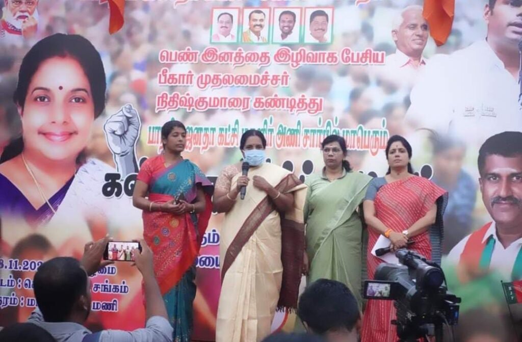 ‘பீகார் முதல்வர் நிதீஷ்குமார் பெண்கள் குறித்தும், மக்கள் தொகை கட்டுப்படுத்துவது குறித்தும் அறுவருக்க தகவல் வகையில் பேசி உள்ளார். அவரது பேச்சைக் கண்டித்து பா.ஜ.க வினர் கடுமையான கண்டனங்களை பதிவு செய்து நாடு முழுவதும் பா.ஜ.க மகளிர் அணி சார்பில் ஒவ்வொரு மாவட்டத்திலும் கண்டன ஆர்ப்பாட்டங்கள் நடைபெற்று வருகிறது. இதனை தொடர்ந்து, தனது வார்த்தைகளை திரும்ப பெறுவதாக நிதீஷ்குமார் கூறி உள்ளார்.