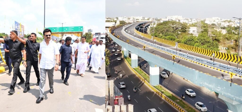 இதனைத் தொடர்ந்து காரில் பயணித்தபடி மேம்பாலத்தை முதல்வர் ஸ்டாலின் பார்வையிட்டார். அப்போது அங்கிருந்த மக்களை பார்த்து முதல்வர் ஸ்டாலின் கையசைத்தார். தொடர்ந்து பொதுமக்கள் பயன்பாட்டுக்கு இந்த பாலம் அனுமதிக்கப்பட்டுள்ளது. பாலம் திறப்பு விழாவையொட்டி நேற்று இரவு மேம்பாலம் மின் விளக்குகளால் அலங்கரிக்கப்பட்டு ஜொலித்தது.