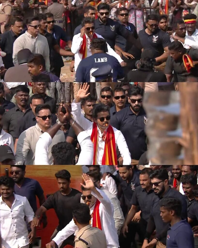 தமிழகத்தில் சட்டமன்ற தேர்தல் பிரசாரம் சூடு பிடித்துள்ளது. திமுக, அதிமுக, தவெக, நாம் தமிழர் கட்சி என 4 முனைப் போட்டி நிலவி வரும் நிலையில் அரசியல் கட்சி தலைவர்கள் தமிழகம் முழுவதும் தீவிர பிரசாரம் மேற்கொண்டு வருகிறார்கள். அந்த வகையில், முதல் முறையாக தேர்தல் களம் காணும் தவெக தலைவர் விஜய்யும் தனது கட்சி வேட்பாளர்களை ஆதரித்து தமிழகம் முழுவதும் ஒவ்வொரு மாவட்டமாக சென்று பிரசாரம் செய்து வருகிறார்.கன்னியாகுமரி மாவட்டத்தில் போட்டியிடும் த.வெ.க. வேட்பாளர்களை ஆதரித்து விஜய் இன்று பிற்பகல் பிரசாரம் செய்தார். இதற்காக விஜய் இன்று காலை 10.20 மணிக்கு சென்னை நீலாங்கரையில் உள்ள தனது இல்லத்தில் இருந்து காரில் புறப்பட்டார். காலை 11 மணியளவில் அவர் சென்னை விமான நிலையத்தை சென்றடைந்தார். பின்னர் அவர் அங்கிருந்து விமானம் மூலம் தூத்துக்குடி சென்றார். பகல் 12.30 மணியளவில் விஜய் தூத்துக்குடி விமான நிலையத்தில் இருந்து வெளியே வந்தார்.அங்கு அவரை பார்ப்பதற்காக ஏராளமான தொண்டர்கள் நின்று கொண்டிருந்தனர். அவர்களை பார்த்து விஜய் கையசைத்தார். அதன்பிறகு அங்கு நிறுத்தப்பட்டு இருந்த வேனில் ஏறி விஜய் சாலை மார்க்கமாக கன்னியாகுமரி சென்றார். தூத்துக்குடி விமான நிலையத்தில் இருந்து விஜய் வேனில் சென்ற போது வழி நெடுக ஏராளமான ஆண்களும் பெண்களும் திரண்டு நின்று உற்சாக கோஷம் எழுப்பி அவரை பார்த்து கையசைத்தனர். பதிலுக்கு விஜய்யும் வேனுக்குள் இருந்தபடியே அவர்களை பார்த்து கையசைத்தார்.