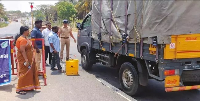 கேரளாவில் இருந்து வரும் வாகனங்கள் சோதனை செய்யப்பட்டு, கிருமி நாசினிகள் தெளிக்க உத்தரவு.