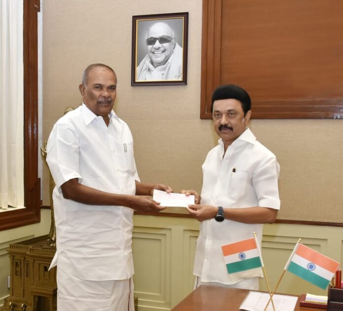 தலைமைச் செயலகத்தில் முதலமைச்சர் மு.க.ஸ்டாலினை சந்தித்து இலங்கை மக்களுக்கு உதவும் வகையில் ஒரு மாத சம்பளத்திற்கான காசோலையை வழங்கினார் சபாநாயகர் அப்பாவு