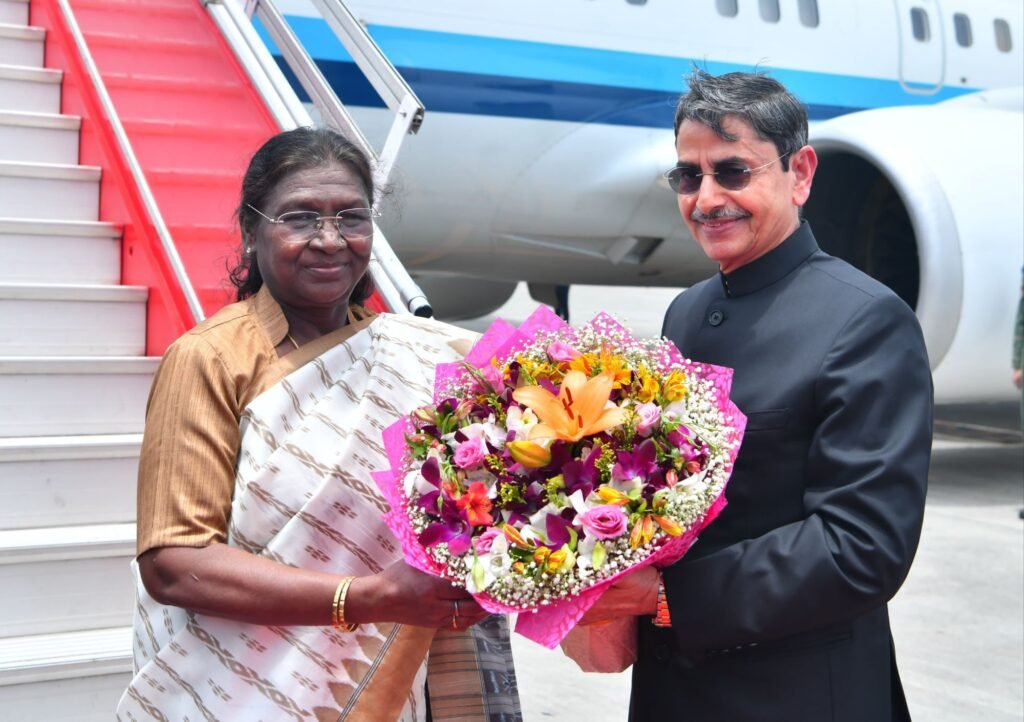 மைசூருவில் இருந்து சிறப்பு இந்திய விமானப் படை விமானம் மூலம் சென்னை வந்தார். விமான நிலையத்தில் அவரை கவர்னர் ஆர்.என்.ரவி, துணை முதலமைச்சர் உதயநிதி ஸ்டாலின் ஆகியோர் வரவேற்றனர். மேலும் அமைச்சர் தா.மோ.அன்பரசன், சென்னை மாநகர மேயர் பிரியா, டி.ஆர்.பாலு எம்.பி., தமிழ்நாடு அரசு தலைமைச் செயலாளர் முருகானந்தம், தமிழ்நாடு காவல் துறை டி.ஜி.பி. வெங்கட்ராமன், சென்னை மாநகர காவல் ஆணையர் அருண், இந்திய ராணுவத்தின் முப்படை உயர் அதிகாரிகள் உள்ளிட்டோரும் ஜனாதிபதியை வரவேற்றனர்.